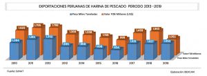 Las exportaciones peruanas de estos dos productos han mostrado en los últimos 10 años un comportamiento estable. Así, podemos ver que en el caso de las exportaciones de harina de pescado en el año 2010 alcanzaban 1.094 millones de toneladas, con un valor de US$ 1.623 millones (US$1.483,55/Tn), habiéndose logrado alcanzar el tope en las exportaciones en el año 2013, con 1.313 millones de toneladas, con un valor de US$ 1.798 millones (US$ 1,369.38/Tn).