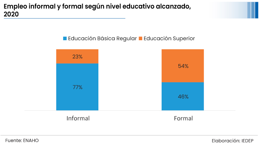 Las características educativas varían entre los trabajadores informales y formales: en el primer grupo solo el 23% alcanzó educación superior, mientras que en los formales el 54%. Esto se traduce en los ingresos de ambos tipos de trabajadores.