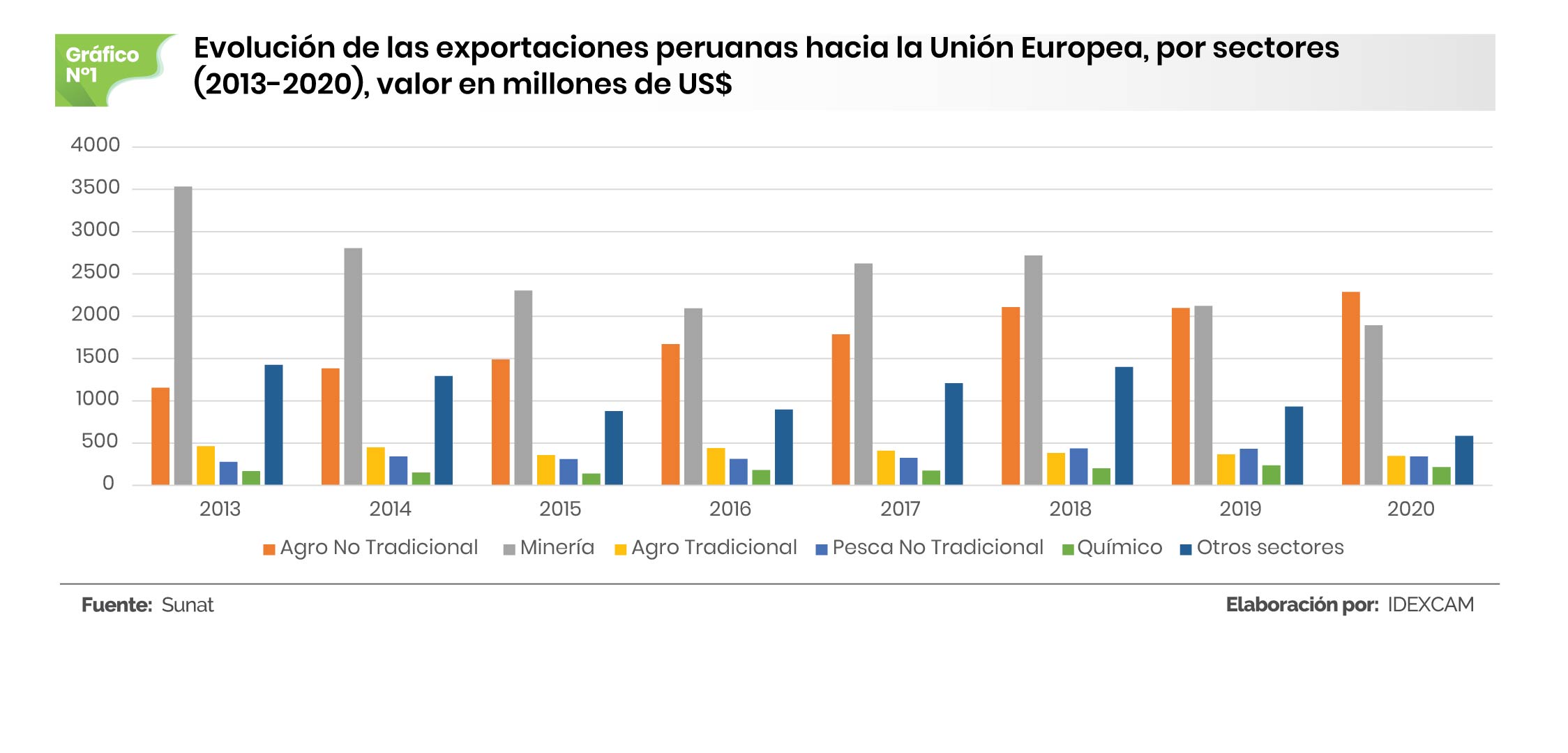 La Unión Europea es uno de los principales destinos para nuestras exportaciones. Desde la firma del tratado, los envíos del sector Agro no Tradicional fueron los que más crecieron, de US$ 1.153 millones, en el año 2013; a 2.287 millones, en el 2020 (+98,3%).