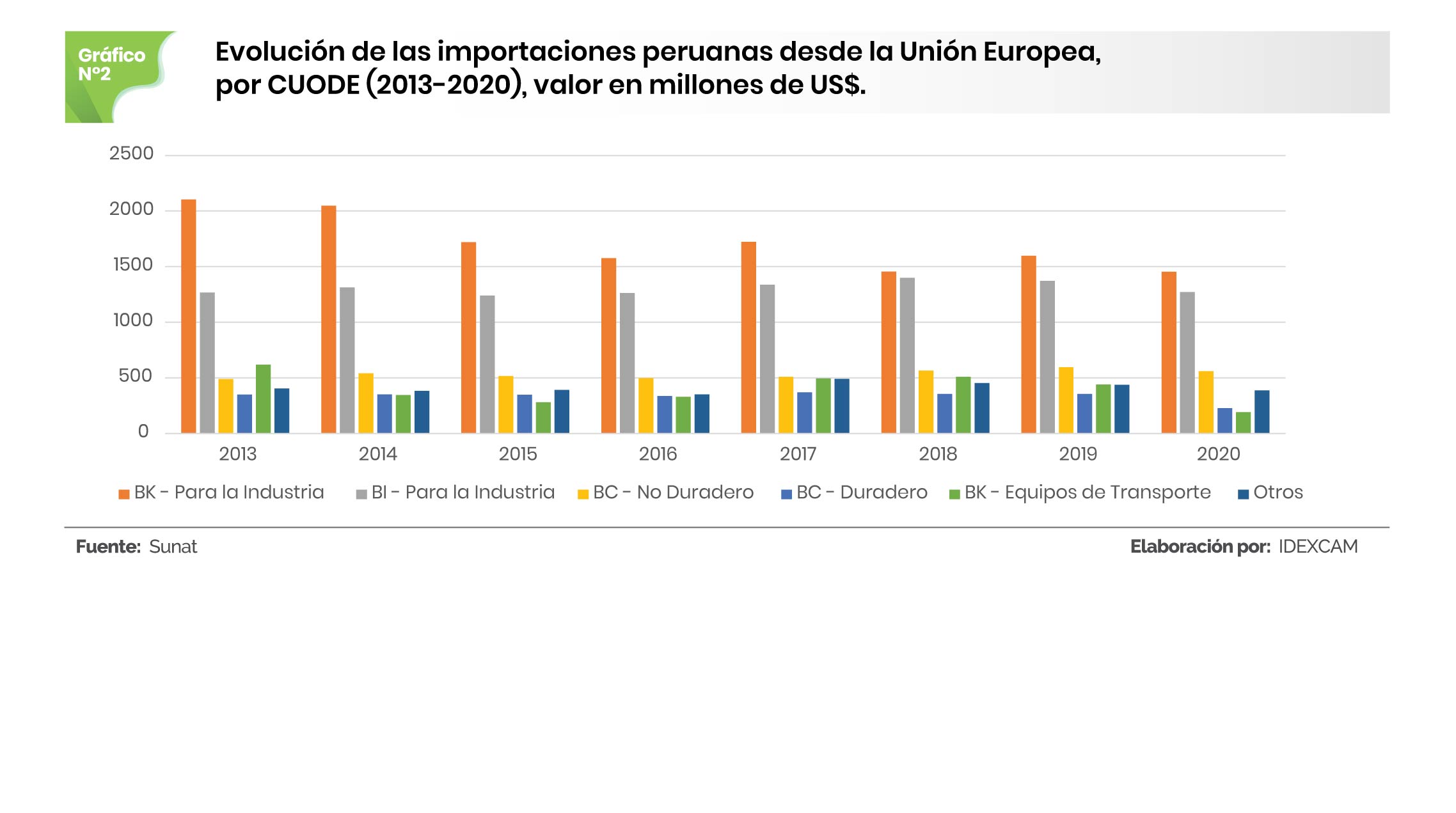 En cuanto a las importaciones peruanas desde la Unión Europea, desde la firma del TLC, las compras de bienes intermedios para la industria se incrementaron 0,3%, de US$ 1.267 millones en el año 2013 a US$ 1.272 millones en el 2020.