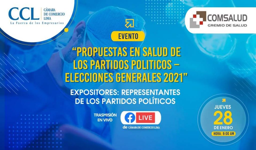 Representantes de los partidos políticos expondrán sus planes de gobierno en el sector salud con miras a las elecciones generales de abril del 2021, enfatizando sus propuestas para enfrentar la pandemia del coronavirus, en un evento virtual que se realizará mañana y que es organizado por la Cámara de Comercio de Lima (CCL).