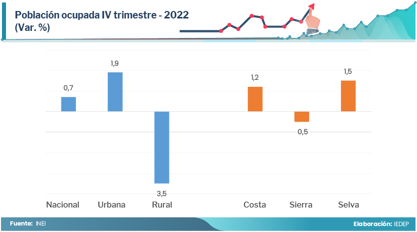 La información disponible del INEI da a conocer que en el 2022, el empleo informal urbano creció a una tasa superior (4,7%) a la del empleo nacional (3,7%). Así, el trabajo informal creció en la Costa (7,7%) y Sierra (1,2%), mientras que se redujo en la selva (-2,3%). Cabe señalar que el empleo rural es en su gran mayoría informal.