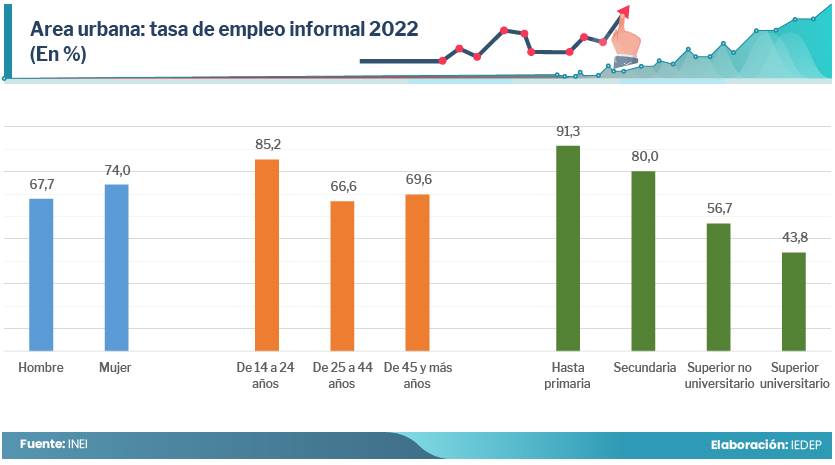 Como se ha observado en los últimos años, el empleo informal es mayor en mujeres que en hombres. En el 2022, dicha tasa en varones llegó al 67,7% y en el sexo femenino al 74%.