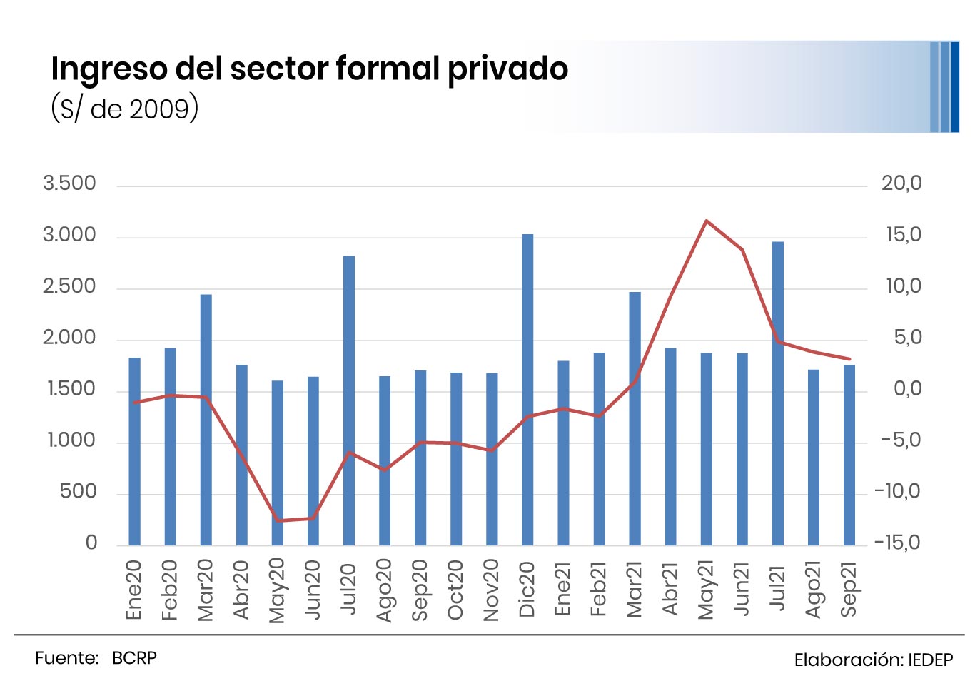 Tomando como fuente el Banco Central de Reserva del Perú (BCRP), se observa que el empleo formal del sector privado al mes de setiembre llegó a 3’869.422 trabajadores, con una tasa de crecimiento de 9,9% respecto al 2020 y de 0,4% respecto al 2019.