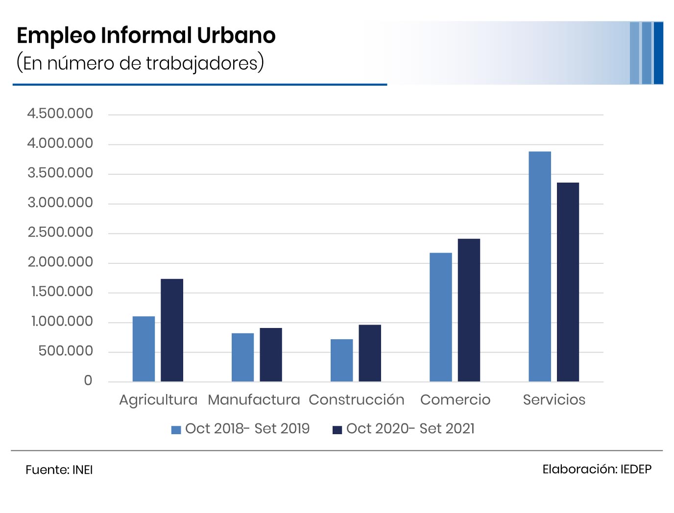 El crecimiento del empleo informal entre octubre del 2020 y setiembre del 2021 ha sido de 686.000 puestos de trabajo respecto al periodo octubre 2018-setiembre 2019. Es importante precisar que 630.200 de estos empleos se han concentrado en la agricultura, que es de lejos el sector que absorbió la mayor cantidad de trabajadores.