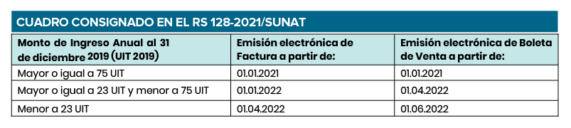 En ese sentido, la más reciente y definitiva incorporación fue dictada mediante Resolución de Superintendencia Nº 128-2021/SUNAT, publicada en el diario oficial El Peruano el 30.08.2021, que estableció que las empresas con ingresos anuales menores a 23 UIT (S/96,600 soles) al 31 de diciembre del 2019, quedarían obligadas, este año 2022, a emitir facturas y boletas de venta electrónicas a partir de los meses de abril y junio, respectivamente.