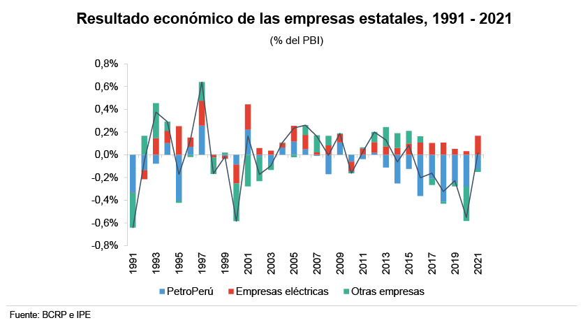 Cabe resaltar que el Fondo Nacional de Financiamiento de la Actividad Empresarial del Estado (Fonafe) administra 35 empresas y fuera de esta se encuentra PetroPerú. Esta última, según el economista jefe del Instituto Peruano de Economía (IPE), Víctor Fuentes, enfrenta problemas de gestión y se sostiene, en buena parte, con el financiamiento extraordinario respaldado implícitamente por el Estado. Es así que, en los últimos 10 años, los resultados económicos negativos de la empresa equivalen en promedio al 0,21% del PBI cada año, de acuerdo con datos del Banco Central de Reserva del Perú (BCRP).
