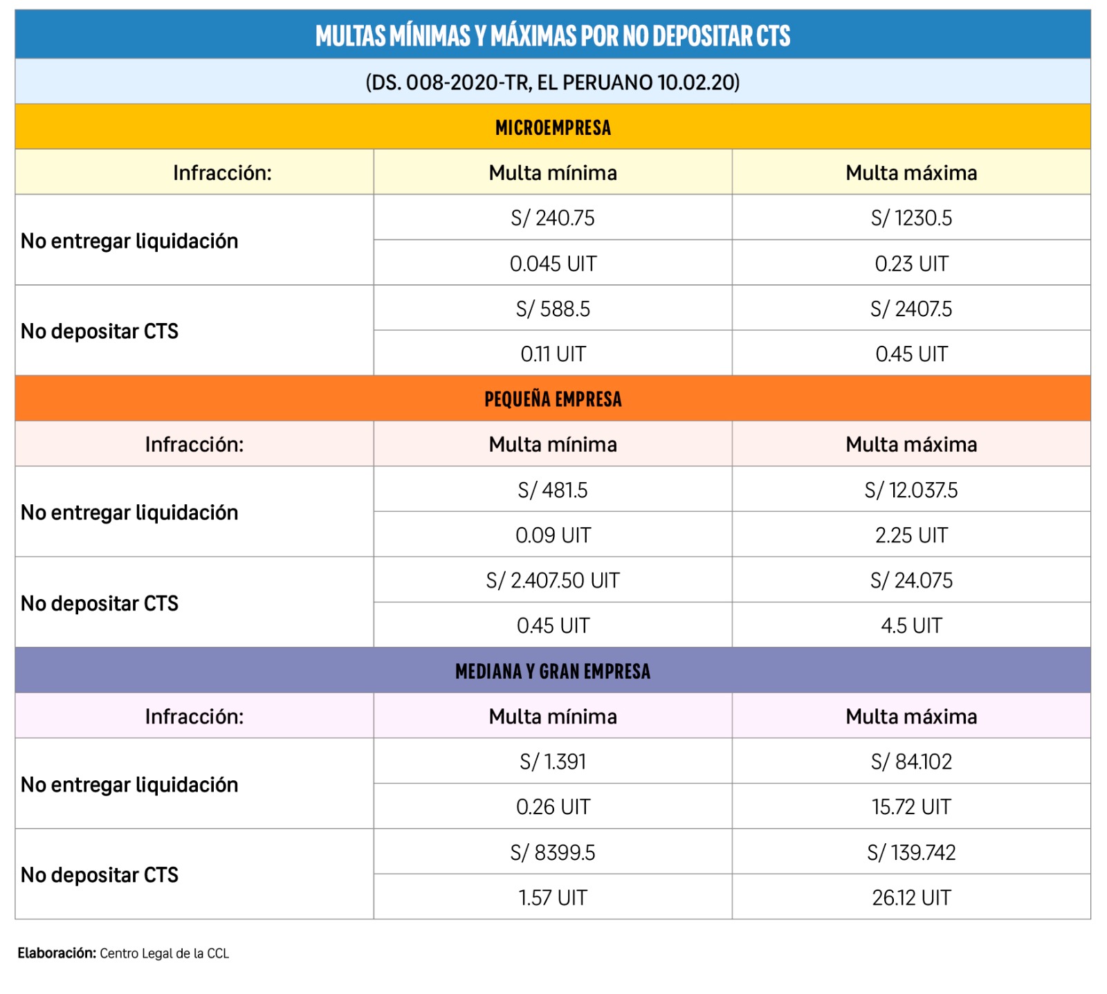 La CCL presenta el cuadro respectivo donde se indican las multas mínimas y máximas por infracciones leves y graves vinculadas a la CTS, según se trate de microempresas, pequeñas empresas y medianas y grandes empresas.