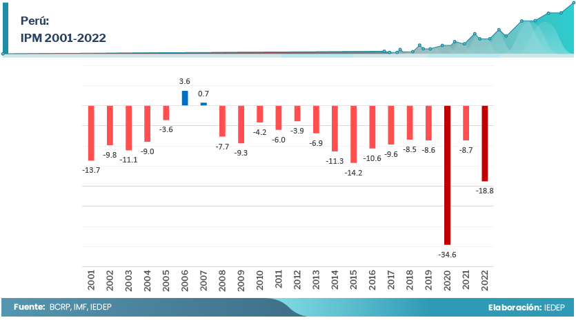 El año de peor IPM (-34,6) en lo que va del siglo fue 2020 como consecuencia de la pandemia y las medidas para combatirla. La considerable caída del PBI (-11%), el incremento del desempleo (-13,9% de la PEA) y el elevado déficit fiscal (-8,9% del PBI) fueron las principales causas de tal desempeño.