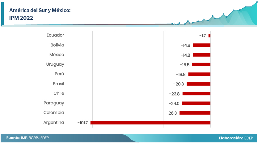 En el análisis comparativo entre países de la región, la economía con menor IPM,  ocupando el décimo lugar, fue Argentina (-101,7) ahogada por una inflación de 95%, la tasa más alta entre los países analizados. Mantiene un déficit fiscal del 3,5% del PBI y con un nivel de deuda pública, que representa el 76% de su PBI, solo por debajo de Bolivia (82,6%) y Brasil (88,2%). A su favor tiene la evolución de los commodities agrícolas que le han permitido registrar un déficit externo de apenas 0,3% del PBI.