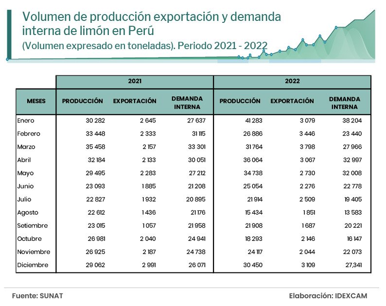 Según la base de datos de Midagri, la demanda anual de limón en Perú se estima en aproximadamente 300 000 toneladas, con una demanda interna particularmente fuerte entre diciembre y abril, ya que son los meses más calurosos en la costa peruana, en donde se consume más limón para la preparación de diferentes comidas (ceviche) y bebidas (emoliente, limonada, chicha morada).