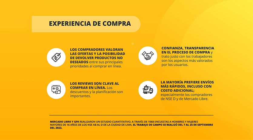 Mercado Libre y GfK realizaron un estudio cuantitativo, a través de 1068 encuestas a hombres y mujeres mayores de 16 años de los NSE AB al D de la ciudad de Lima. El trabajo de campo se realizó del 7 al 25 de septiembre del 2023.