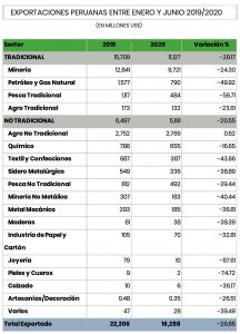 Según la tabla No 1, las exportaciones del sector tradicional y no tradicional cayeron estrepitosamente en 29% y 21% respectivamente en el primer semestre del presente año, en comparación al mismo periodo del año 2019.