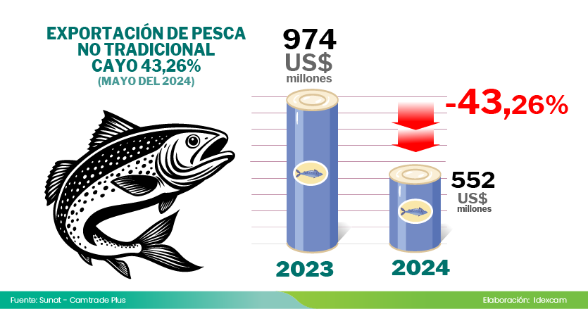 Las exportaciones de pesca no tradicional reportaron una significativa caída de 43,26 % entre enero y mayo de este año con respecto a similar periodo de 2023, tras sumar US$ 552 millones en envíos, informó el Instituto de Investigación y Desarrollo de Comercio Exterior de la Cámara de Comercio de Lima (Idexcam).