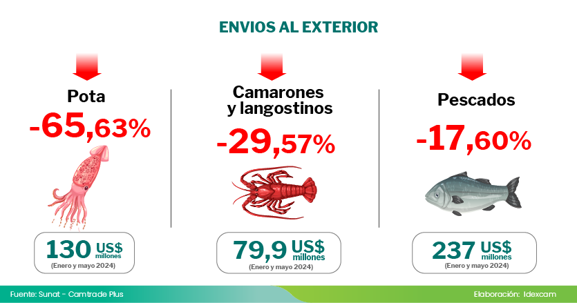 “Las principales razones de esta caída son los menores envíos de pota congelada, camarones y langostinos los que registraron un dinamismo negativo en el periodo de análisis”, manifestó Óscar Quiñones, jefe del Idexcam.