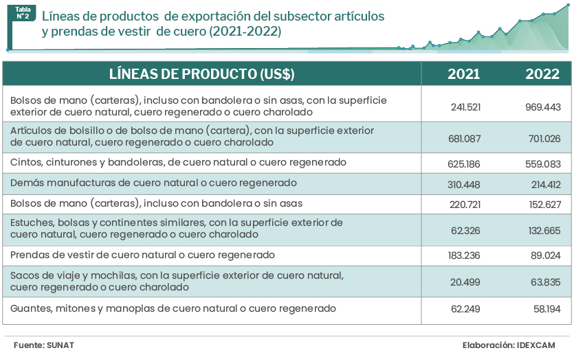 Las exportaciones del subsector “Artículos y prendas de vestir de cuero” llegaron a 53 destinos comerciales en el 2022, por un valor de US$ 3,8 millones, un crecimiento del 13% respecto al 2021. Si bien es cierto, que las cifras mostradas no son muy alentadoras debido a su bajo volumen de comercialización, debemos tomar en cuenta que es un subsector seminuevo que está tomando relevancia poco a poco.