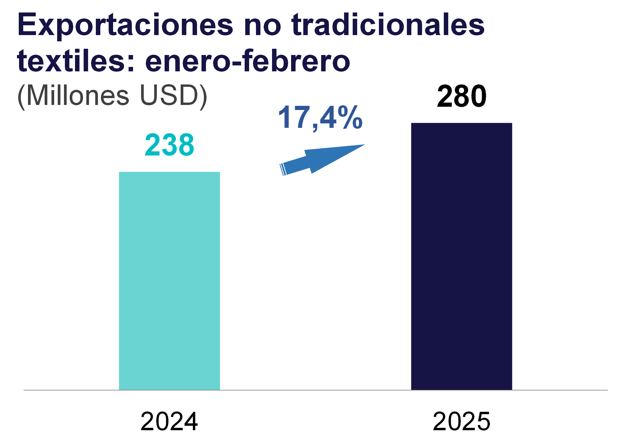En términos acumulados, las exportaciones de productos textiles sumaron entre enero y febrero US$ 280 millones, un crecimiento de 17,4 % respecto a las del mismo periodo del año previo.