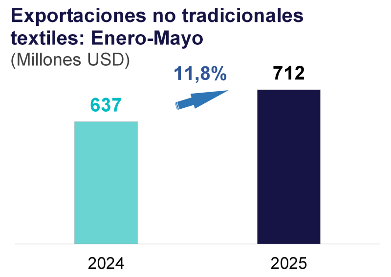 Las exportaciones de productos textiles sumaron US$ 712 millones en el acumulado de enero a mayo último, un crecimiento de 11,8 % respecto al mismo periodo del año previo.