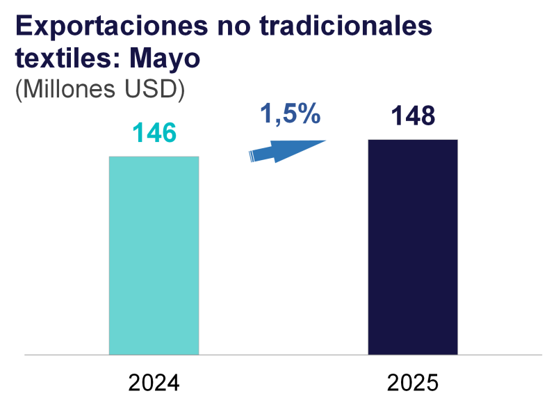 Por otro lado, el volumen exportado creció 0,3 % interanual. Este incremento alcanzado se explica principalmente por los mayores despachos de fibras de alpaca y llama a China y tejidos de algodón a Colombia. Los envíos de prendas de vestir a Estados Unidos se mantienen al mismo nivel de mayo del año pasado (desde abril 2024, el sector empezó a recuperarse a tasa de dos dígitos) y los destinados a Venezuela, Canadá e Italia se han reducido.