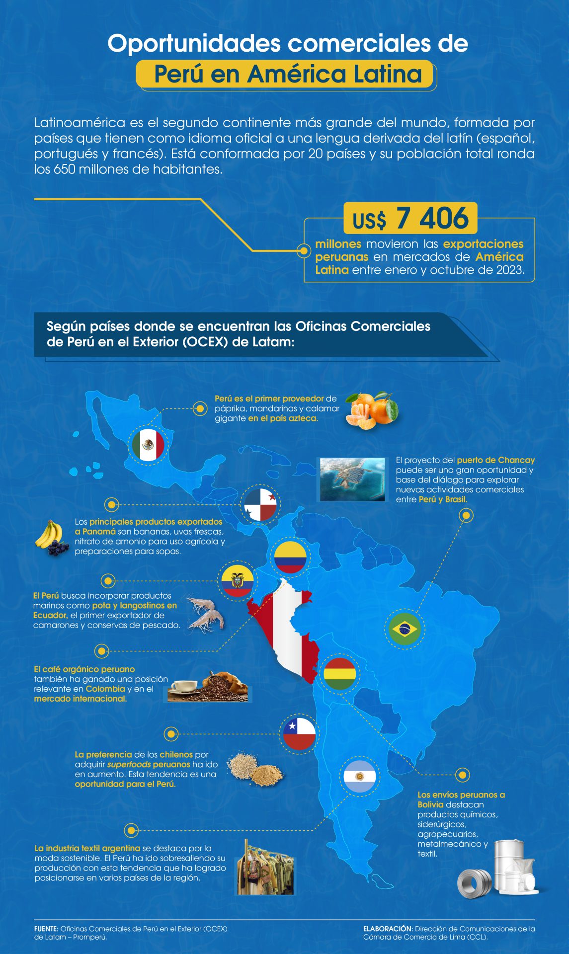 Según la Comisión de Promoción del Perú para la Exportación y el Turismo (Promperú), entre enero y octubre de 2023, unas 5 121 empresas enviaron 4 205 productos a los mercados de América Latina, por un monto de US$ 7 406 millones.