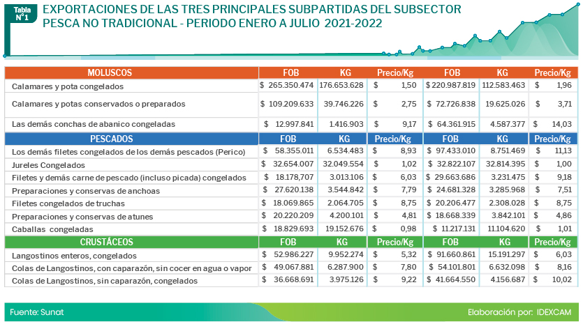 Haciendo una comparación de las exportaciones entre los periodos de enero a julio de 2021 y 2022, en las principales subpartidas del subsector moluscos los envíos de calamares y pota congelados disminuyeron en 16,71% en cuanto al valor y 36,26% en cuanto al volumen. Sin embargo, sí se observa un crecimiento en el precio por kilogramo de US$ 0,46.