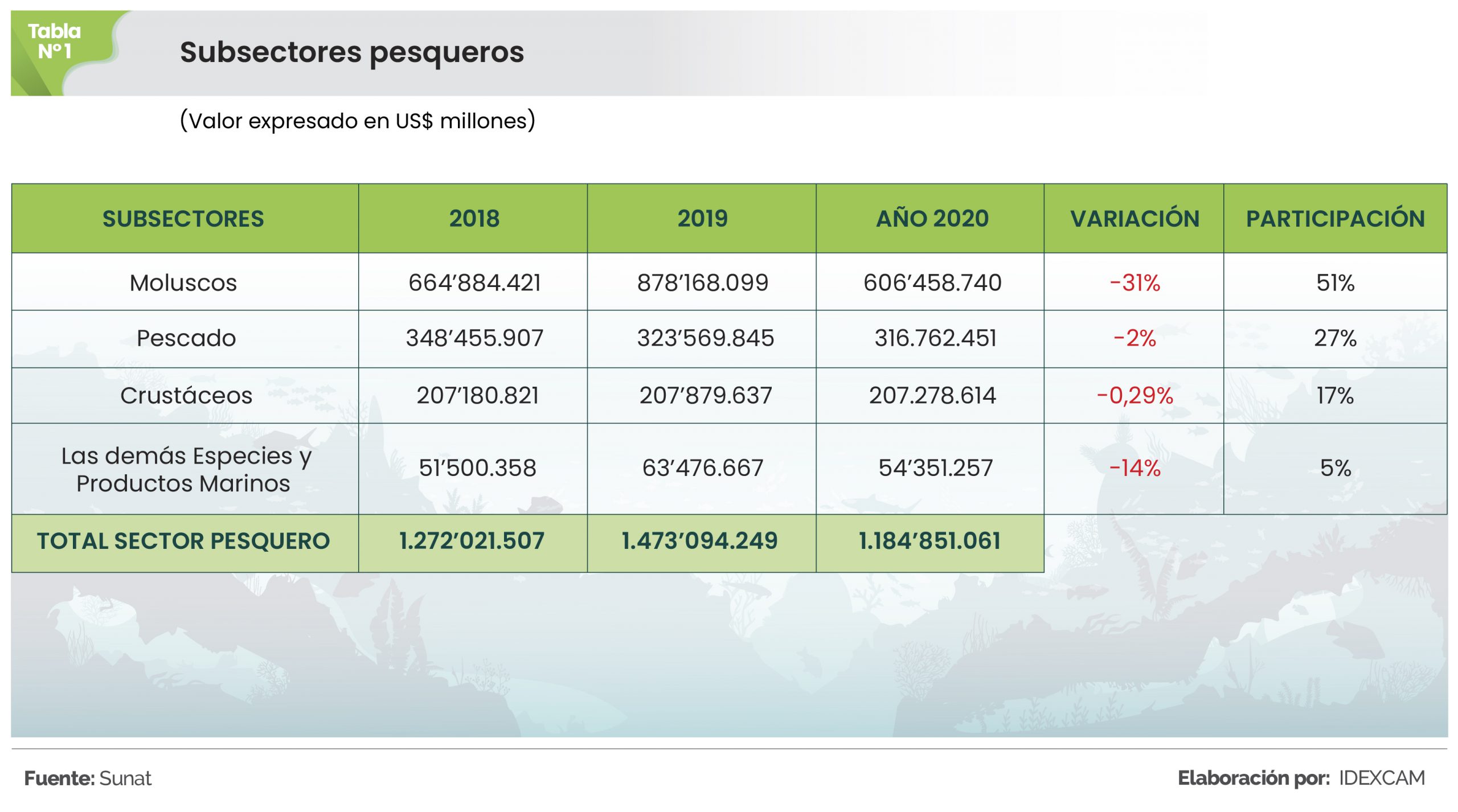 Los cuatro subsectores de pesca: “moluscos”, “pescado”, “crustáceos” y “las demás especies y productos marinos”, registraron resultados negativos en sus envíos al exterior en el 2020. El subsector con la mayor caída fue moluscos (-31%), seguido de las demás especies y productos marinos con (-14%), y pescado (-2%).