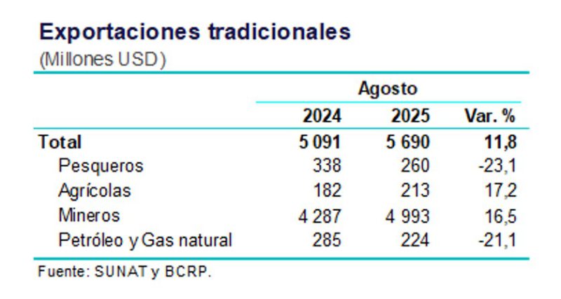 En cuanto a las exportaciones de productos tradicionales, estas sumaron USD 5 690 millones en agosto, un crecimiento de 11,8 % interanual.