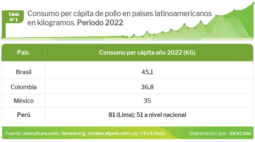 Según la Ceva Santé Animale (CEVA), en el 2022 el consumo por habitante de carne de pollo en el Perú fue de 81 kilogramos (kg) en la ciudad de Lima y de 51 kg a nivel nacional. Estas cifras, comparadas con el consumo por habitante de otros países de Latinoamérica, superan los 45,1 kg de Brasil, los 36,8 kg de Colombia y los 35 kg de México.