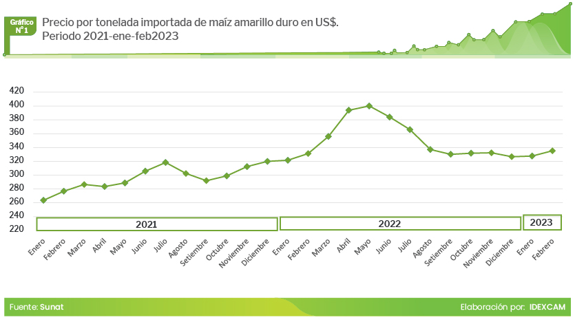 Al analizar los datos de las importaciones peruanas de maíz amarillo duro, observamos que el precio por tonelada importada mostró una tendencia al alza desde octubre del 2021, al pasar de los US$ 299, hasta llegar al pico de US$ 400 en mayo del 2022. En los meses posteriores se observó una caída en el costo por tonelada importada, y en febrero del 2023 alcanzó los US$ 335.