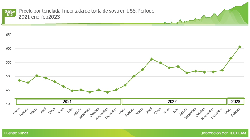 En cuanto a las importaciones de tortas de soya, se observó que el precio por tonelada de la soya ha venido en ascenso desde diciembre del 2021, hasta llegar a un pico en abril del 2022, cuando alcanzó los US$ 562 por tonelada. En adelante el precio tuvo un comportamiento oscilante, y desde noviembre pasado el costo viene creciendo de manera sostenida, hasta totalizar en febrero del 2023 los US$ 606 por tonelada.