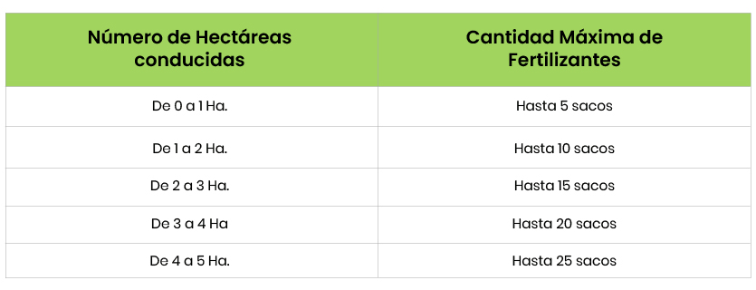 Según se dispuso en el artículo 5 del referido decreto de urgencia, el fertilizante se entregaría de acuerdo a la cantidad de hectáreas que gestionan y al tipo de cultivo, estableciéndose una escala (ver tabla).