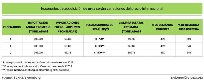 Teniendo en consideración esta disposición del gobierno, podemos proyectar tres escenarios, de acuerdo con los datos con que se cuenta sobre las importaciones de urea realizadas durante los meses de marzo y abril del presente año, así como el valor de la cotización internacional publicada por Bloomberg el 27 de mayo pasado (US$ 1.170 por tonelada).