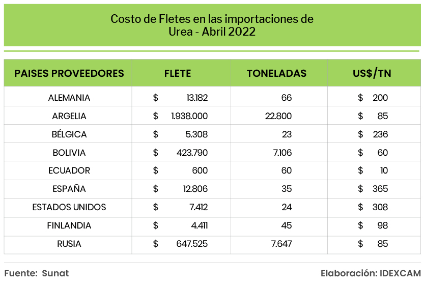 De acuerdo con la información estadística de la Superintendencia Nacional de Administración Tributaria (Sunat), al cierre de abril pasado, para el caso de la urea (en todas sus presentaciones para uso agrícola), el valor CIF promedio llegó a los US$ 820 por tonelada, registrándose ese mes la importación de 37.806 toneladas.