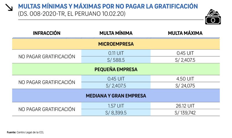 El Centro Legal de la Cámara de Comercio de Lima (CCL) informa que los empleadores que no paguen o no depositen la gratificación hasta el 15 de julio serán sancionados con multas diferenciadas, conforme al régimen laboral de la empresa, al considerarse una infracción grave.