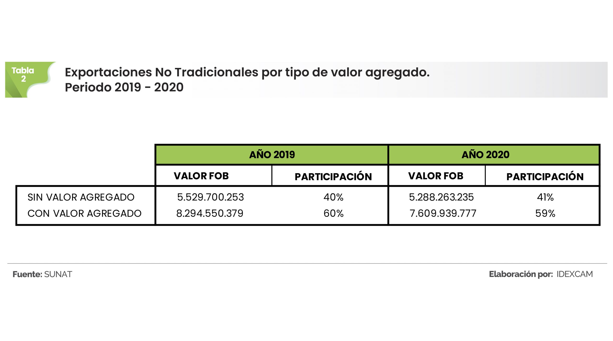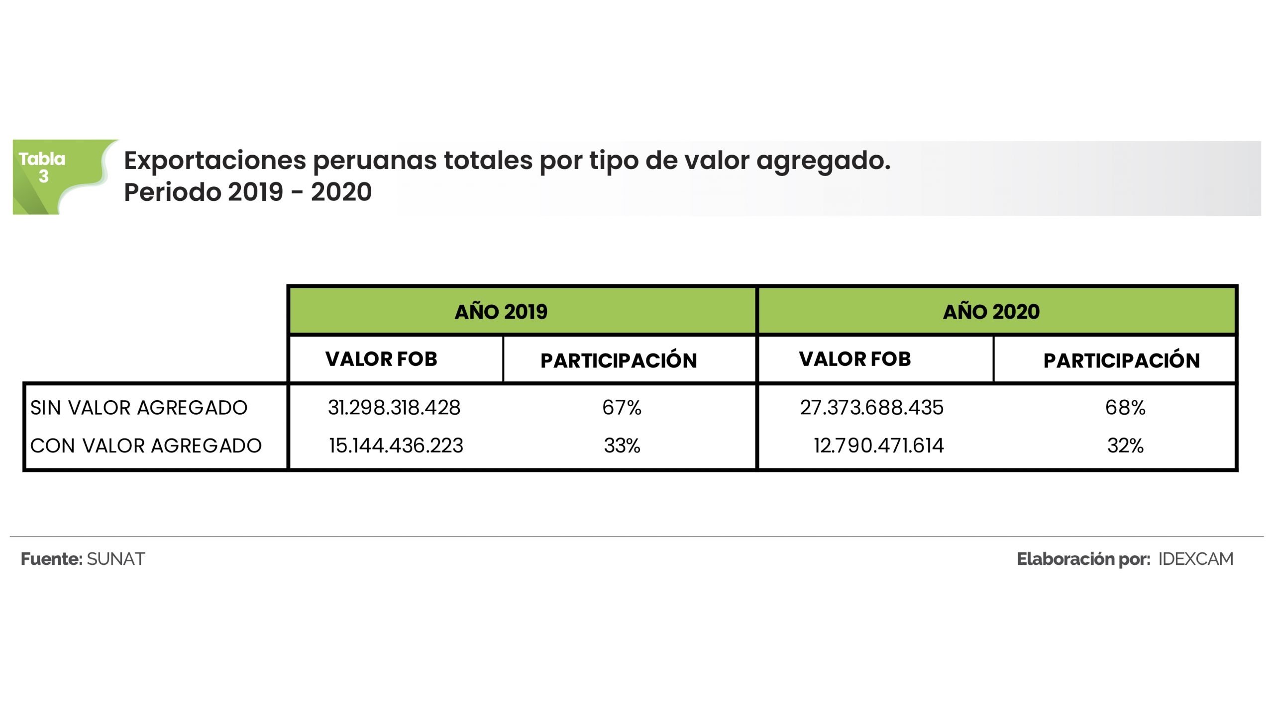 Teniendo en cuenta esta forma de clasificar las exportaciones, tenemos que, por lo menos, un 33% del total de las exportaciones totales peruanas del año 2019 correspondieron a exportaciones con valor agregado, mientras que en el 2020 descendieron a 32% (Tabla N°3).