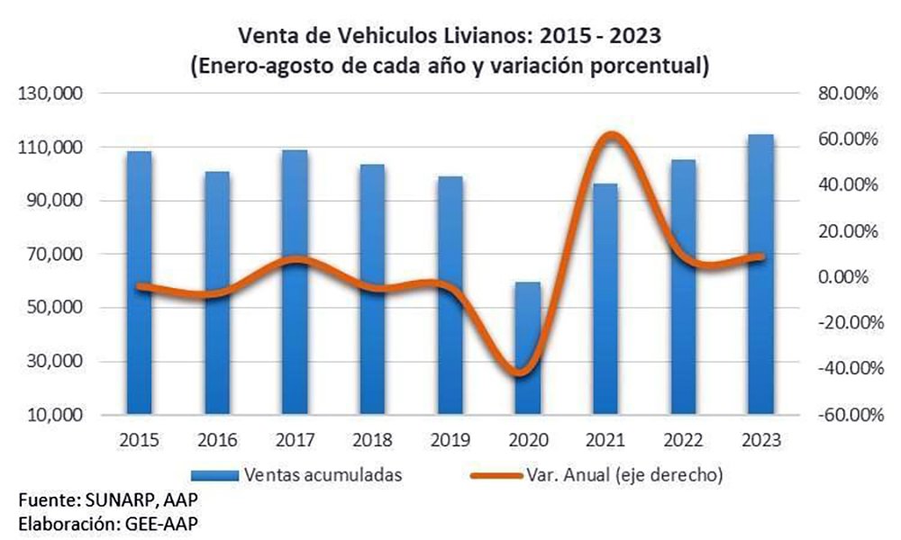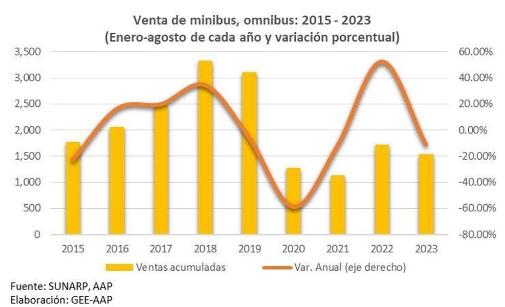 En tanto, la venta de minibús y ómnibus se situaron en 208 unidades en el octavo mes del 2023 (+16.9% interanual), y llevaron a que se comercialicen 1,532 vehículos durante los primeros ochos meses del 2023, descendiendo en -10.9% en comparación con igual lapso del año pasado, desde el -14.1% del mes anterior. Durante el 2023, el comportamiento de las ventas de dichos vehículos ha sido determinado por “la turbulenta situación social que atravesó el país durante los primeros meses del año, sumado a los fenómenos climatológicos que provocaron el desborde de ríos e inundación de carreteras, dificultando el tránsito vehicular y desalentando la adquisición de estas unidades, aunado a algunos problemas financieros que enfrentaron varias empresas de transporte urbano” señaló.