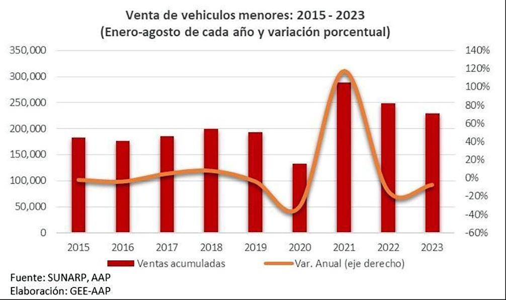 Finalmente, para el economista, la venta de vehículos menores se situó en 30,812 unidades en agosto último (-0.1% interanual), mientras que en entre enero y agosto las ventas llegaron a 229,749 unidades, número menor en -7.4% respecto a igual periodo del 2022. Al descomponer por segmento se observa que la venta de motos llegó a 160,673 unidades (-7.3%) y la de trimotos fue de 69,076 unidades (-7.5%).