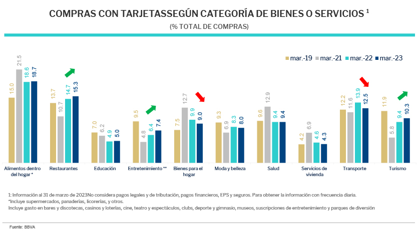 En gasto por rubro, lo que ha estado más dinámico en el primer trimestre de este año con respecto a enero-marzo de 2022 es entretenimiento, lo que incluye bares discotecas, casinos, loterías, cines, clubes, que creció a un ritmo de 29%. Asimismo, el gasto de turismo se incrementó en 17% y de restaurantes en 12% (ver cuadro). Ya todos los rubros de gasto que medimos están por encima del nivel prepandemia (2019). En el caso de algunos rubros ya se está normalizando el consumo, como en los supermercados, donde el gasto ya se moderó, teniendo en cuenta que en pandemia se compraba para almacenar, pero aun así está por encima del nivel prepandemia.