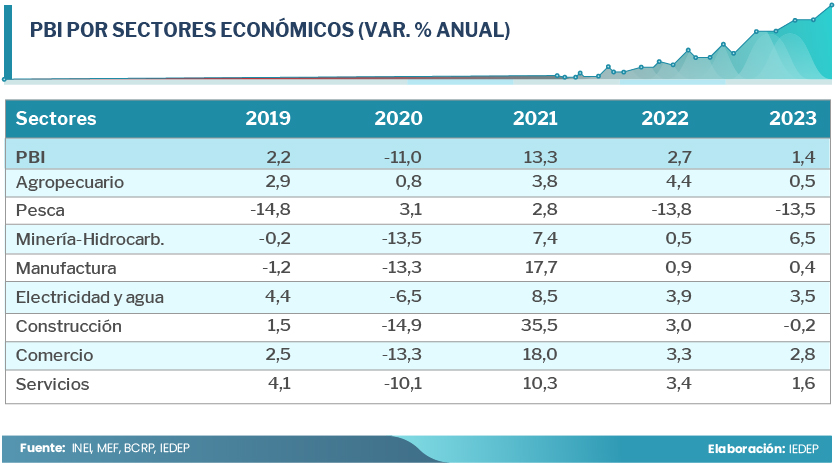 Los sectores que concentran alrededor del 40 % de la producción peruana han mostrado una performance negativa en los primeros cinco meses del año. Es el caso de los rubros Telecomunicaciones y Financiero, mientras que la Construcción y Manufactura registraron caídas en cuatro meses. Asimismo, son pocos los sectores con un crecimiento importante, entre estos figuran la Minería e hidrocarburos (8,2 %), Electricidad, gas y agua (5,4 %), Comercio (2,6 %), Alojamiento y restaurantes (5,6 %) y Otros servicios (4,2 %).
