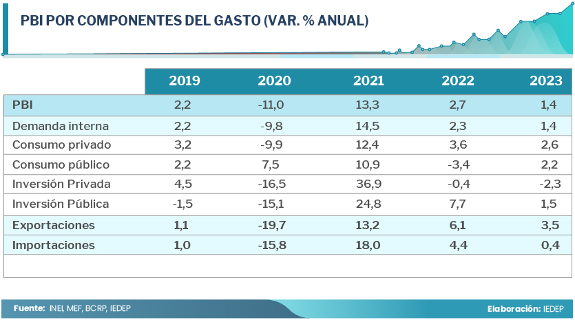 En el 2023, la demanda interna se expandiría en 1,4 %, cifra por debajo del 2,3 % del 2022. Ello, como resultado fundamentalmente de la inversión privada, que representa la quinta parte de la demanda interna y que caería en 2,3 % este año.