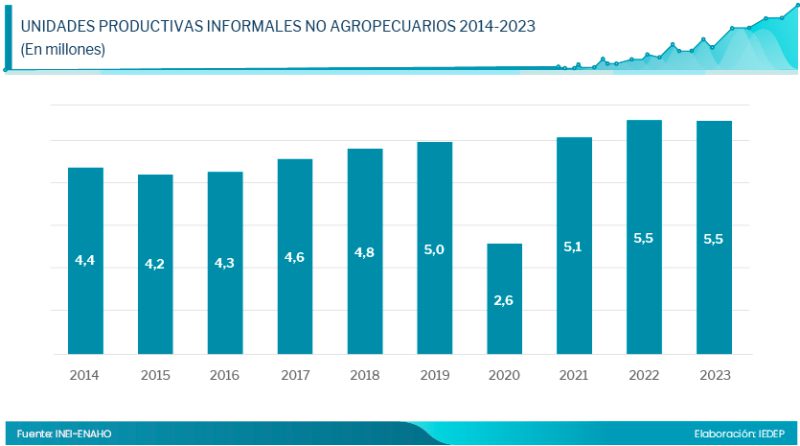 El análisis del IEDEP estima que, al 2023, había 5 500 000 de negocios informales, con una leve caída de 0,3 % con respecto al 2022. Cabe precisar que en este total hay que incluir las UP informales agropecuarias que suman 2 600 000, pero que para fines del presente artículo no han sido consideradas.