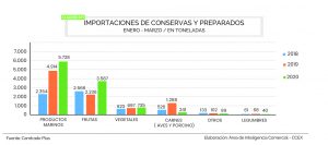Analizando con detalle el movimiento de las importaciones peruanas, podemos ver que las adquisiciones del exterior de conservas y alimentos preparados de fácil consumo ascendieron a 10.429 toneladas, registrando un crecimiento del 12% con respecto al primer trimestre del año 2019 (9.284 toneladas). Si lo vemos en valores monetarios, este año fueron US$ 28.328 millones. Según el Centro de Comercio Exterior (CCEX) de la Cámara de Comercio de Lima (CCL), este incremento se debe, principalmente, a la preferencia de los consumidores por productos no perecibles que puedan almacenar por periodos largos de tiempo sin fechas de vencimiento cercanas. Otro punto importante en este comportamiento de compra fue la prevención ante un posible desabastecimiento de alimentos frescos en nuestro país.