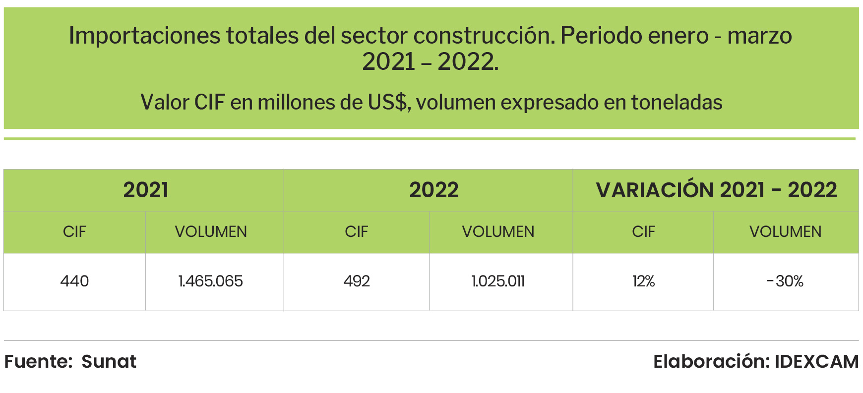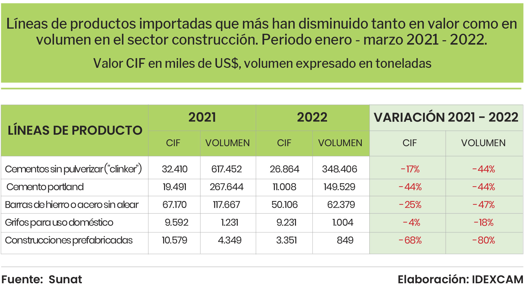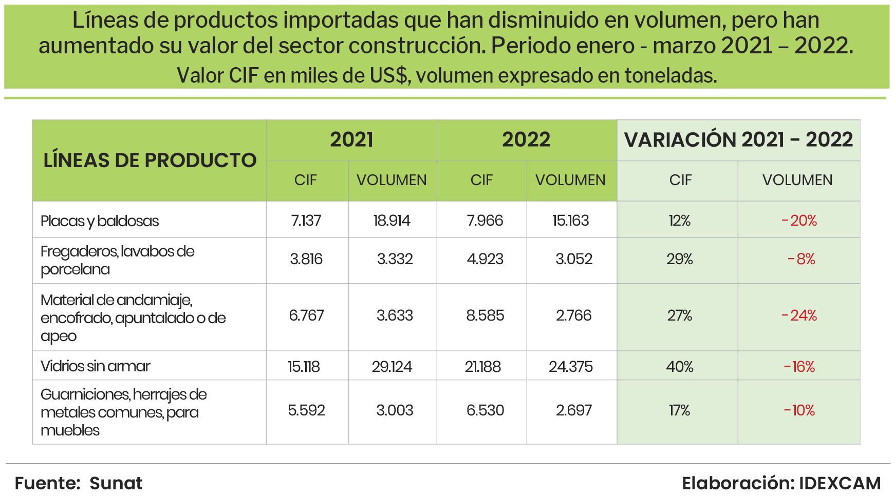 Otro aspecto relevante al analizar las importaciones del sector construcción, está referido a las líneas de productos importadas que han disminuido en volumen, pero han aumentado su valor en el primer trimestre del año 2022.