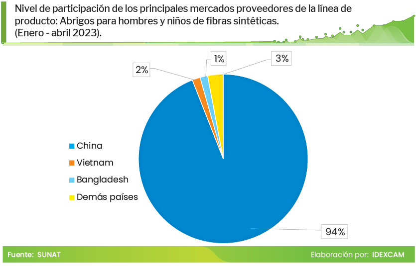 Los abrigos para hombres y niños de fibras sintéticas es la principal línea de producto de prendas de vestir para invierno importada en el primer cuatrimestre del 2023, con 41% de participación. Se importaron en total 1’876.947 unidades, un 21% más respecto a similar periodo del 2022. El principal proveedor de esta línea fue China, con una participación de 94%, seguida de Vietnam y Bangladesh.