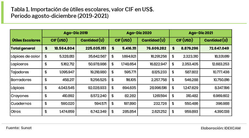 En el periodo de agosto a diciembre del 2020 se importaron 232.726 cuadernos por el valor de US$ 197.890, montos que mostraron caídas de 61% en cuanto a cantidad y 66% en cuanto a valor frente al similar periodo de 2019. En el 2021, la cantidad importada totalizó 396.988 (+71%) por US$ 550.486 (+178%). Hay que destacar que dichos valores no superaron los montos del 2019.