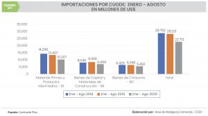 De enero a agosto del 2020, las importaciones peruanas sumaron US$ 22.712 millones, registrando una disminución de US$ 5.510 millones, que representó -19,5% con respecto a similar periodo del 2019.