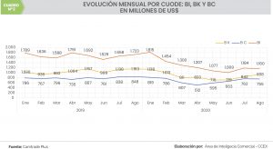 En segundo lugar, tenemos las importaciones de productos de bienes de capital y materiales de construcción (BK), que concentran el 31% del total importado. Estas compras sumaron US$ 6.999 millones, lo que significa una disminución de US$ 1.459 millones (-17,2%) respecto de similar periodo del 2019.