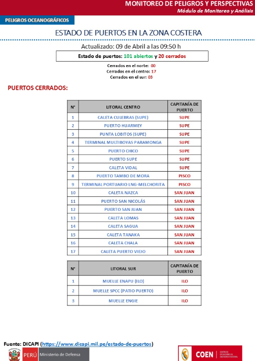 Debido a la presencia de fuertes oleajes en el mar peruano, el Instituto Nacional de Defensa Civil (INDECI), a través del Centro de Operaciones de Emergencia Nacional (COEN), informó el cierre temporal de 20 puertos en el litoral central y sur del país. Esta decisión fue tomada por la Autoridad Marítima Nacional como medida preventiva para resguardar la seguridad de las personas y evitar daños materiales.