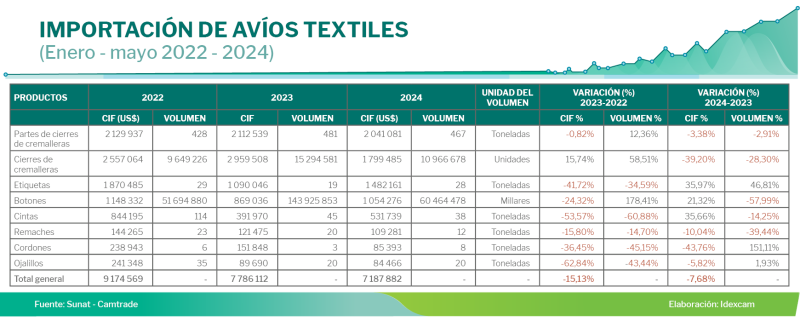 El año 2023 cerró con una caída en el nivel de importaciones de avíos textiles del 19,19 % en valor, totalizando US$19 000 000. Según el Instituto Nacional de Estadística e Informática (INEI), la industria Textil y de Cuero cayó un 17,7 %, lo que explica la disminución en la importación de avíos y otros productos intermedios.