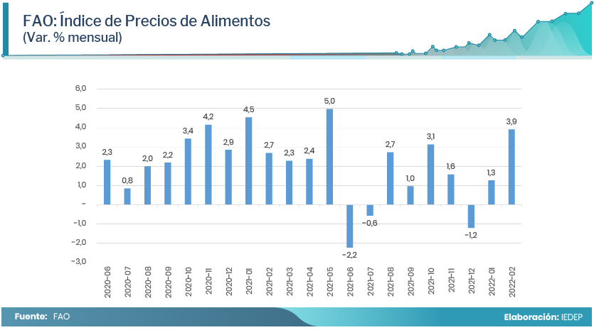 El Índice de Precios de los Alimentos de la Organización Mundial para la Alimentación y la Agricultura (FAO), construido a partir de los precios de los cinco productos básicos más consumidos en el mundo (carnes, lácteos, cereales, aceite y azúcar), mostró en febrero de este año un nivel de 140,7, es decir, un incremento de 3,9% respecto a enero y de 20,7% respecto a febrero 2020. Según la FAO el resultado fue consecuencia del aumento de las cotizaciones del aceite vegetal (8,5%) y los productos lácteos (6,4%) en el último mes.